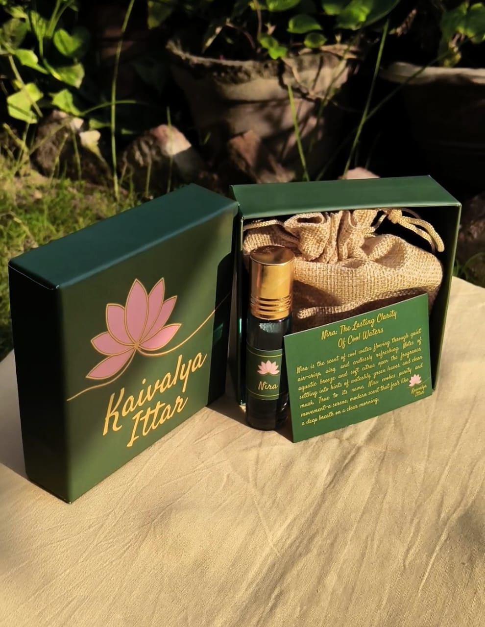 Nira is a cooling, water-inspired ittar with crisp camphor-like freshness and a clean, airy trail. Its fragrance is light, clear, and energizing; perfect for hot days, focused minds, and moments of clarity. Alcohol-free and gentle, Nira is ideal for everyday use on all skin types.